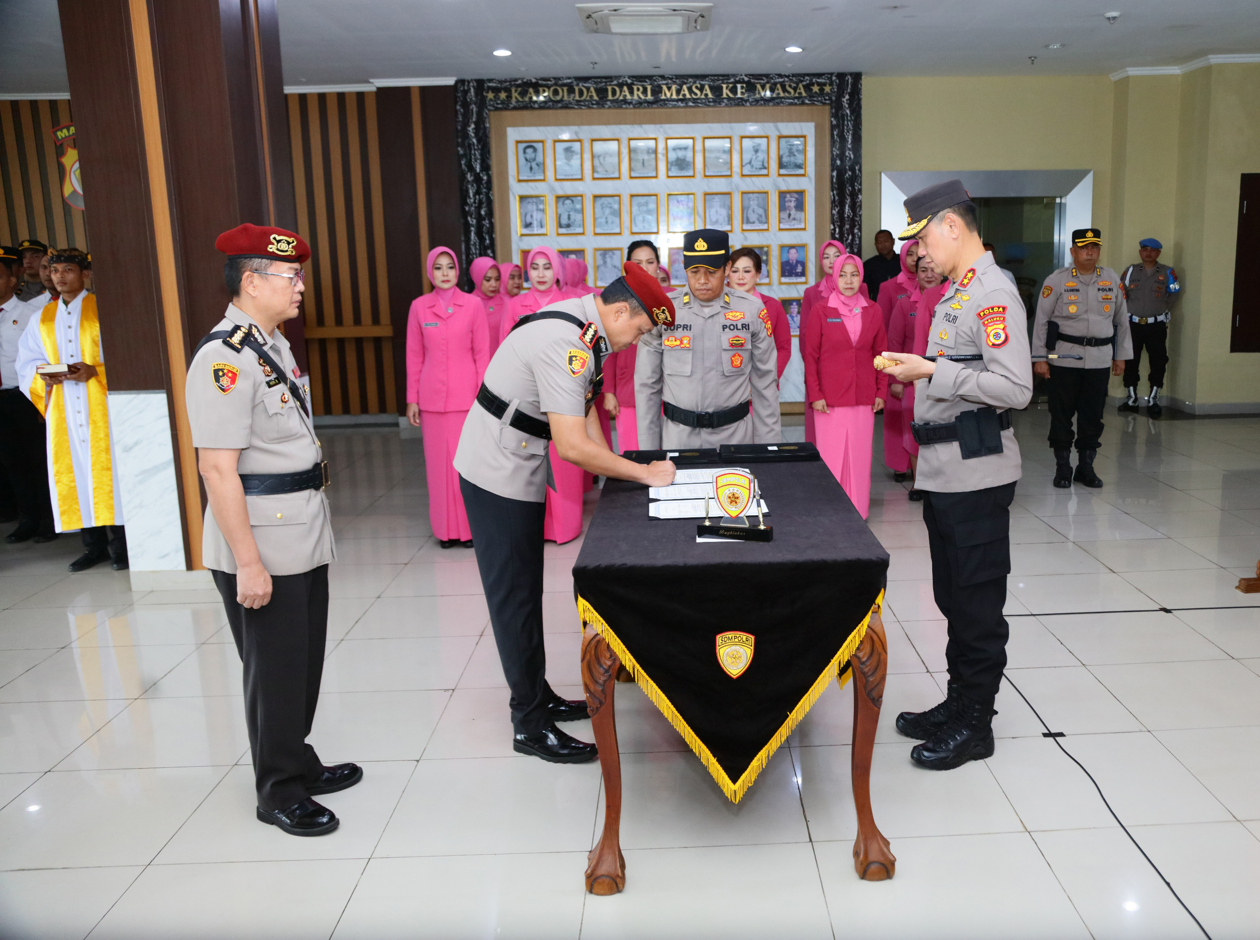 Upacara Sertijab tersebut dihadiri Wakapolda Maluku Brigjen Pol. Imam Thobroni bersama seluruh Pejabat Utama Polda Maluku, para Kapolres jajaran, serta pengurus Bhayangkari Daerah Maluku. Kehadiran unsur pimpinan dan keluarga besar Polri ini mencerminkan soliditas internal institusi dalam setiap proses regenerasi kepemimpinan.