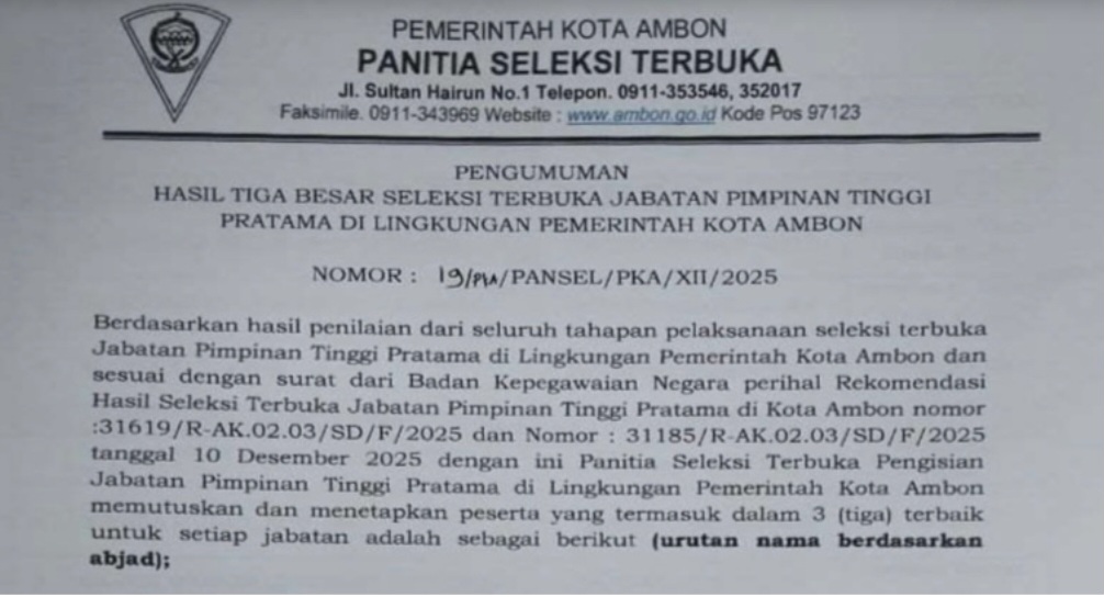 Ambon.malukubarunews.com – Pemerintah Kota Ambon telah mengumumkan hasil seleksi terbuka untuk jabatan pimpinan tinggi pratama (JPTP) di lingkungan Pemkot Ambon. Pengumuman tersebut disampaikan pada Minggu, 14 Desember 2025, melalui Surat Nomor 19/PANSEL/JPTP/XII/2025, yang berisi daftar nama-nama tiga peserta terbaik yang berhasil lolos pada setiap jabatan. Keputusan ini diambil berdasarkan hasil penilaian seluruh tahapan seleksi dan rekomendasi dari Badan Kepegawaian Negara (BKN).