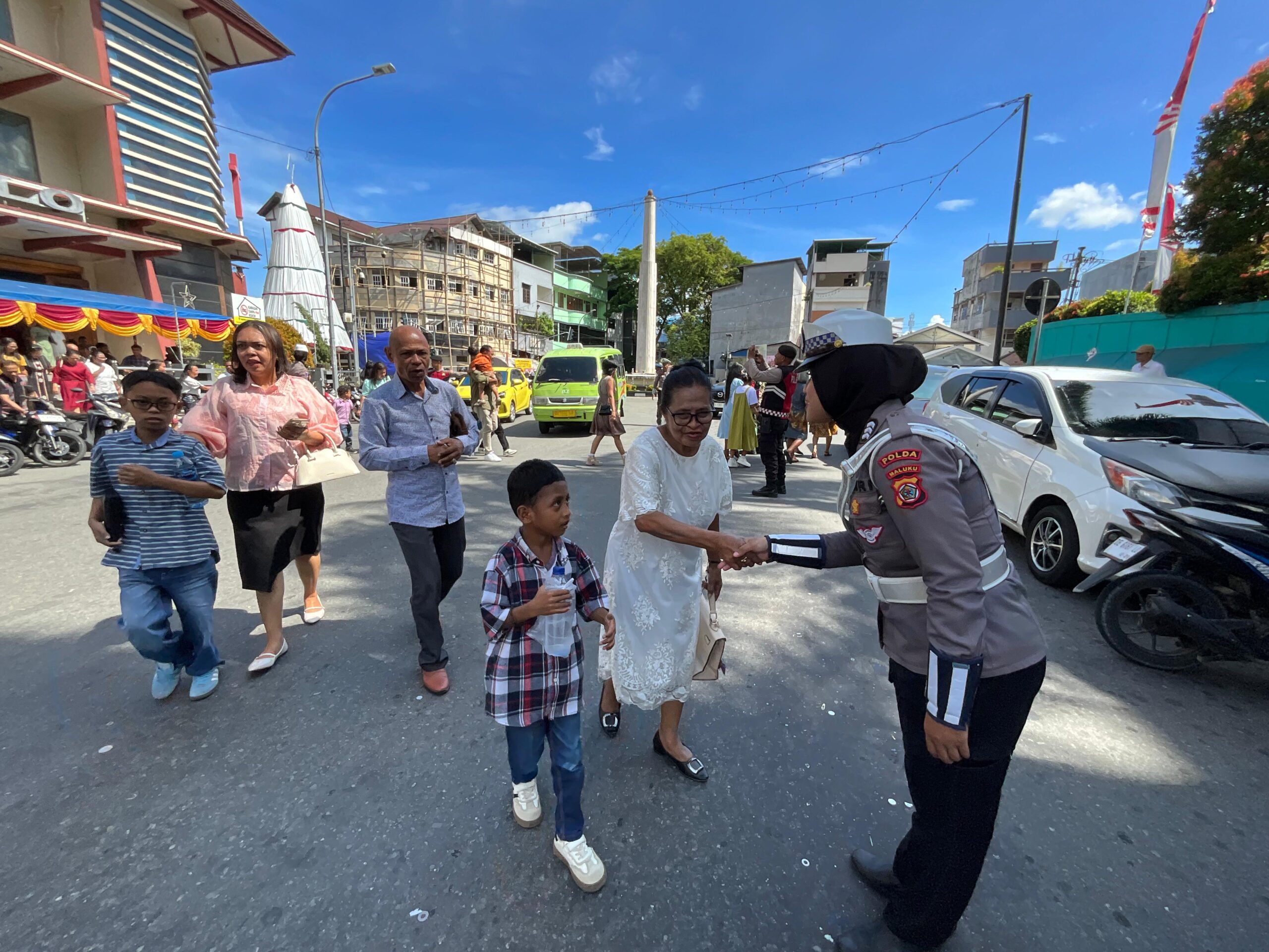 Pendekatan humanis turut menjadi bagian penting dalam pelaksanaan tugas di lapangan. Personel membantu jemaat lanjut usia menyeberang jalan, memberikan arahan kepada pengendara, serta menyapa masyarakat yang hadir mengikuti ibadah sebagai bentuk pelayanan langsung.